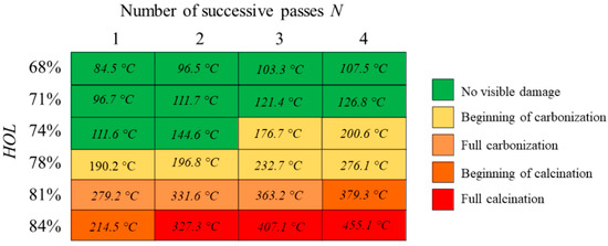 To better understand the variations of the LIBS emission spectra with respect to process parameters, thermal imaging was carried simultaneously with the spectra acquisition. Figure 11 presents the mean values of the maximum temperature recorded by the FLIR camera during the laser processing at different spatial overlaps HOL and for each additional pass N. Laser processing parameters are specified in the caption of Figure 11. Given the thermal loads deposited by each successive pass, the higher the number of successive passes on the same irradiated cavity, the lower the temperature for carbonization and successive calcination. Ablating at increasing spatial overlap induces a slower temperature gradient that that observed by increasing the number of successive passes.
