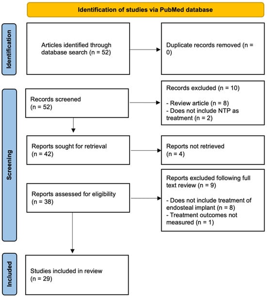 Fifty-two studies were identified through the database search, of which zero were duplicates. Remaining articles’ titles and abstracts were screened based upon the inclusion and exclusion criteria. Ten of these studies were excluded due to the following reasons: (1) the study did not include NTP as treatment or (2) was a review article. Four of the remaining forty-two studies were not included due to inaccessibility. Following a full-text review of the selected studies, an additional nine studies were excluded: those that (1) did not include treatment of endosteal implants or (2) did not measure relevant treatment outcomes. Ultimately, twenty-nine studies qualified for inclusion and are subsequently elaborated upon (Figure 1).
