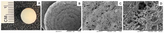 Visualization of 3D-printed constructs. (A) Gross image of biofabricated sample, (B–D) scanning electron microscopy images at 30×, 100×, and 500×, respectively.
