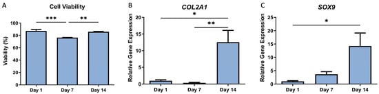 Cellular viability and gene expression of C20A4 cells. (A) Percent cell viability calculated by live dead staining intensity. (B) COL2A1 transcriptional activity, (C) SOX9 transcriptional activity. Error bars represent SD. * p < 0.05, ** p < 0.01, *** p < 0.001.