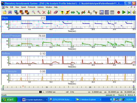 A voicing efficiency recording protocol was used in the PAS. The sensors allowed for the sampling of voice fundamental frequency, sound pressure level, mean airflow rate, and subglottic pressure. The token [pa:pa:] was tested at different SPL values. The source to microphone distance is set by the PAS system. Both systems were triggered, allowing high-speed laryngoscopy and PAS recording. Figure 2 shows a tracing of the recording from a female subject while voicing soft, middle, and loud voices.