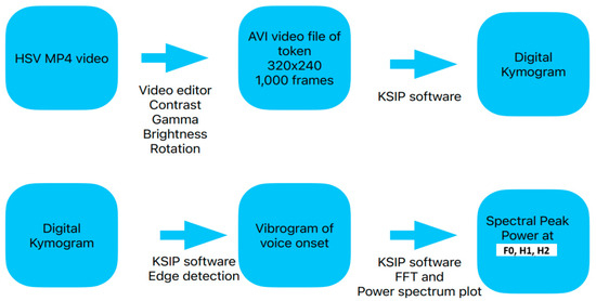 For tokens that could not be analyzed by digital waveform analysis owing to poor image quality, the DKG waveform was “read” by counting the approximate number of video frames between vocal fold adduction and vocal onset. Figure 3 shows a schematic of the steps from the HSV image acquisition to image analysis. Waveform analysis was used to calculate the power-spectrum values derived from the FFT plots. The spectral peak values from each vibrogram waveform can be used to compare different tokens. Thus, a high spectral peak at the fundamental frequency suggests a greater amplitude of vocal fold oscillation than one that has low amplitude. A spectral peak that is flat and poorly defined suggests frequency splaying when compared with a sharp well defined peak [13].