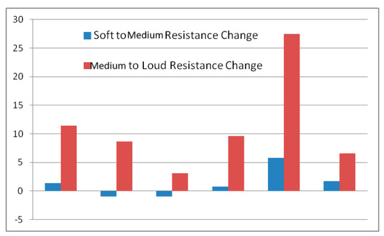 Plot of the changes in resistance per dB for the six subjects for soft to middle voice and middle to loud voice.