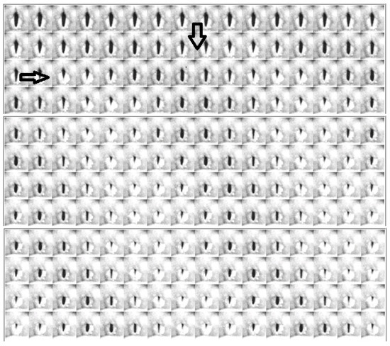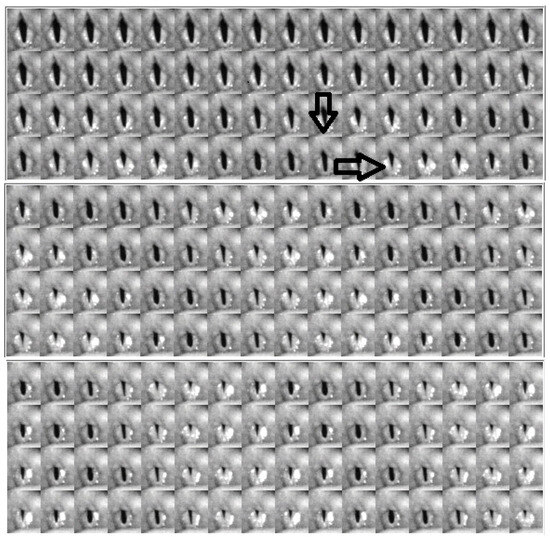 Figure 5, Figure 6 and Figure 7 show the video montages of each video for female Subject 4 for the three tokens. Figure 5 shows the montage of the voice onset for soft phonation (212 Hz, 76 dB). Figure 6 shows a montage for medium phonation (215 Hz, 85 dB). Figure 7 shows a montage for loud phonation (217 Hz, 90 dB). In each instance, the vocal folds were approximated toward the midline before the onset of the vibration. For each figure, the down arrow indicates a just noticeable vibration and the second arrow the beginning of steady state oscillation. Vibrations occur before full vocal fold closure. After steady oscillation is achieved, there is a typical glottis configuration for the intended fundamental frequency and SPL. With increasing SPL, some adjustments were made to the supraglottic posture to achieve the intended SPL. Typically, three to four glottal cycles are necessary to achieve a soft phonation steady state. A similar finding was observed in medium phonation with a more pressed inward movement of the false fold. The vocal folds seem to shorten as time progressed (Figure 6). These changes occurred during the first 50 ms of phonation. With loud phonation, more frames showed glottal and supraglottic adjustments before reaching a steady state. (Figure 7). In this example, almost twice the onset time from noticeable phonation to steady state was observed compared to that with soft phonation.
