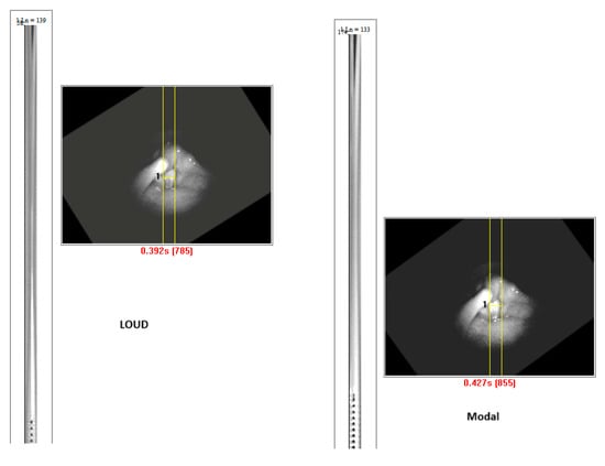 - Woo, P. High-speed Imaging of Vocal Fold Vibration Onset Delay: Normal Versus Abnormal. J. Voice 2017, 31, 307–312. [Google Scholar] [CrossRef]