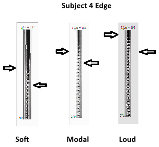 DKG tracing of and edge tracking for subject 4 with soft, middle, and loud phonation. Right arrow is the just noticeable vibration. Left arrow is the beginning of steady state of vocal fold oscillation.
