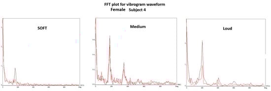Figure 10 shows the edge-tracking software for Subject 4 with soft, medium, and loud phonations. The edge-tracking software performed credible edge tracking and plotted the edge as a vibrogram waveform. The vibrogram waveform can be transformed into FFT plot to analyze the vocal fold oscillation signal properties at different SPL values, as shown in Figure 11. With soft phonation, the sinusoidal pattern of vocal fold oscillation results in peak signal power at the fundamental frequency. No significant energy was observed at higher harmonics. With loud phonation, a stronger energy peak was observed at the fundamental frequency, as well as the first and second harmonics. This harmonic energy increase is consistent with the observation of short open and longer closed phases of vocal fold oscillation. These higher spectral energy peaks indicate a higher amplitude of vocal fold oscillations and faster opening and closing of the vocal folds with loud phonation [13]. The higher energy peaks and energy at higher harmonics were consistent with the visula observation of higher velocity change and acceleration of the vocal folds during loud phonation. There was a higher amplitude of vocal fold oscillations with loud phonation than with soft or medium phonation. Larger spectral peaks with loud phonation were a consistent finding, as shown in Figure 12 and Figure 13 for the two female subjects. These figures show an increase in the F0 energy with an increase in SPL. Increases in F1 and F2 energies with increasing SPL were also observed.