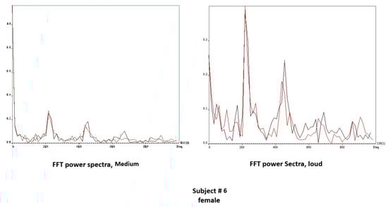 Vibrogram FFT plot of middle versus loud phonation (Subject 3).