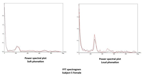 Vibrogram FFT plot of middle versus loud phonation (Subject 5).