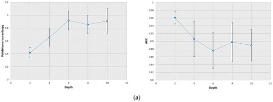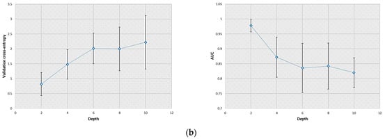 The train–validation–test scheme was repeated twenty times to improve the statistical reliability of the results. The validation cross-entropy, plotted in Figure 2, increased with the depth of the CNN for both tasks investigated. This result was most likely due to the overfitting issue that can occur when adding many hidden layers in the neural network.