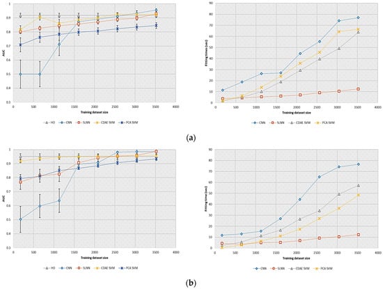 In these experiments, the detection performance of the selected models was evaluated on a reduced number of training images in order to be consistent with the realizations achievable in clinical practice. Figure 3 shows the AUC and fitting times obtained by the different observers investigated as a function of the training dataset size. We can note that a straight line was plotted to represent the HO performance, as it was estimated from a fixed training dataset.