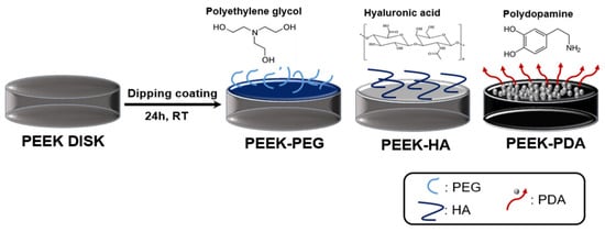 To overcome this problem, PEEK has been fabricated using various surface modifications such as coating methods [,]. We aimed to provide a bioactive function by using a coating technique on PEEK with various biopolymers. In particular, we assumed that it would improve the initial rate of osseointegration onto PEEK using polyethylene glycol (PEG), hyaluronic acid (HA), and polydopamine (PDA) polymers.