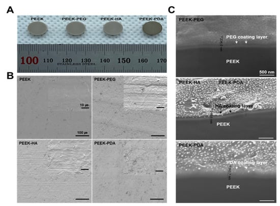 (A) Test specimen images after coating, (B) scanning electron microscope images, and (C) focused ion beam technique images of PEEK, PEEK–PEG, PEEK–HA, and PEEK–PDA.
