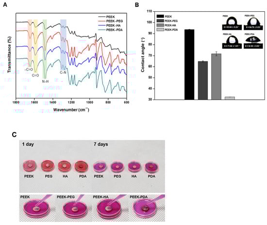 (A) The results of Fourier transform infrared spectroscopy, (B) the value of water contact angles, and (C) the retention results of the coating layers of PEEK, PEEK–PEG, PEEK–HA, and PEEK–PDA for 7 days.