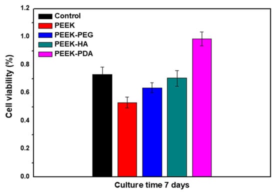 Consequently, the properties of materials such as medical devices that can provide a highly cell-friendly environment are required [,]. The previous reports mentioned above indicated that, similar to our cell biocompatibility results, the PEEK-PDA showed good cell proliferation as compared with other groups due to its enhanced hydrophilicity. Therefore, these results showed that surface hydrophilicity is an important component for cell adhesion and growth on biomaterials for bone tissue regeneration. Despite PEEK-PEG having more hydrophilicity on the surface than PEEK-HA, the result of the cell viability test showed PEEK-PEG to be lower than PEEK-HA due to the retention of the coating layer. This means that owing to the chemical structure, PEG has more hydroxyl groups than HA, so it was rapidly degraded within DMEM.