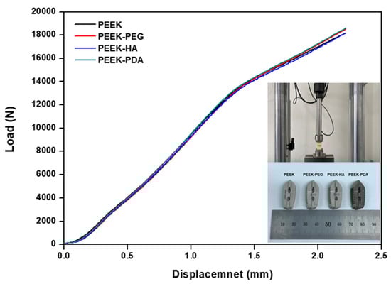 To confirm the mechanical properties of the stability aspect of the commercial product and the coating product, the results of the compression test according to the coating conditions are shown in Figure 5 and Table 2, according to ASTM F2077. During the test, the distance between the intervertebral discs was set to 6 mm, and the yield displacement was calculated to be 0.12 mm, which is 2% of the distance, according to ASTM F2077. This calculation was used to obtain the yield load. The average yield load, which is the main performance indicator, was observed as follows: 10,072.4 N in PEEK, 10,074.5 N in PEEK-PEG, 1019.1 N in PEEK-HA, and 10,090.8 N in PEEK-PDA. These values were very similar. The values of stiffness for PEEK, PEEK-PEG, PEEK-HA, and PEEK-PDA were 8578.4 N/mm, 8549.6 N/mm, 8561.9 N/mm, and 8487.7 N/mm, respectively. Comparatively, the load of PEEK-PDA was found to be about 14 N higher than that of the control group, but this was not statistically significant. In the case of the PEEK, the standard deviation of the compression test tended to be the largest compared to other groups. In the case of stiffness, the experimental group generally showed lower values than the PEEK, but there was no statistically significant difference. After the compression test, the fracture pattern of the intervertebral fusion prosthesis PEEK also showed the same pattern. In the compression tests before and after coating, it was confirmed that there was no significant difference in yield load, stiffness, or fracture patterns.