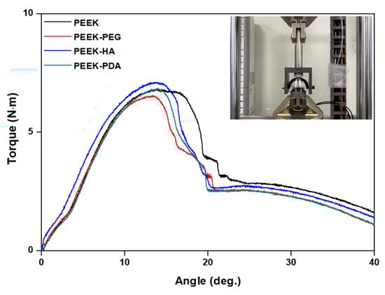 As a result of the static torsion test in Figure 6 and Table 3, the yield torque values were as follows: 6.625 N·m for the control PEEK, 6.427 N·m for PEEK-PEG, 6.635 N·m for PEEK-HA, and 6.585 N·m for PEEK-PDA. These values confirm no significant difference between groups in yield torque and stiffness, which are the main performance indicators.