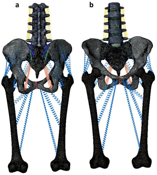 - Joukar, A.; Shah, A.; Kiapour, A.; Vosoughi, A.S.; Duhon, B.; Agarwal, A.K.; Elgafy, H.; Ebraheim, N.; Goel, V.K. Sex Specific Sacroiliac Joint Biomechanics during Standing Upright: A Finite Element Study. Spine 2018, 43, E1053–E1060. [Google Scholar] [CrossRef] [PubMed]