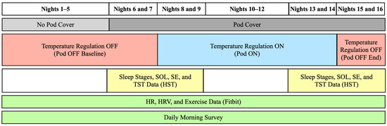Experimental Design Schematic. Subjects (n = 54) spent the first seven nights with temperature regulation off (Pod OFF Baseline) and then spent seven nights with temperature regulation on (Pod ON), followed by the last two nights with temperature regulation off (Pod OFF End). “No Pod Cover” means that subjects slept on their own bed without the Pod cover installed. “Pod Cover” means that subjects were sleeping with the Pod cover on their bed, either with the temperature regulation on or off. Sleep stages, sleep onset latency (SOL), sleep efficiency (SE), and total sleep time (TST) were recorded on Nights 6–9 and 13–16 through a home sleep test device (HST). Throughout the entire study, sleeping HR and HRV, along with daily exercise, were recorded via a Fitbit. Ratings of perceptual comfort and sleep quality were recorded via a daily morning survey.