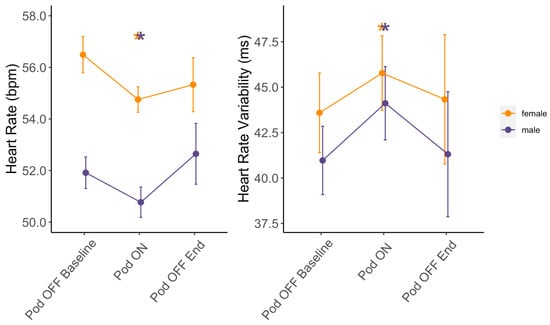 Changes in HR and HRV based on Pod temperature status. Means ± SE for minimum sleeping HR and median sleeping HRV at Pod OFF Baseline, Pod ON, and Pod OFF End stratified by sex (females in orange and males in purple). * Indicates a significant difference in linear mixed models from Pod OFF Baseline at p < 0.05.