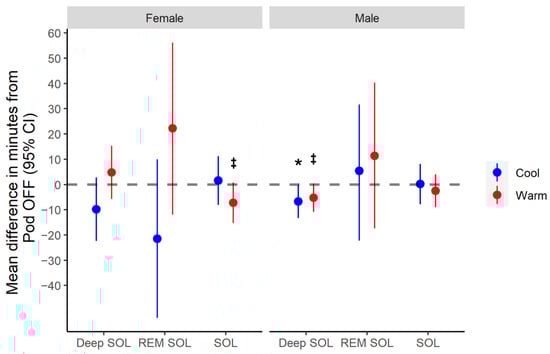 Changes in sleep latency metrics from Pod OFF to ON for cool vs. warm Bedtime temperatures. Mean difference and 95% confidence intervals for the change in sleep onset latency (SOL) and Deep SOL metrics from Pod OFF Baseline vs. Pod ON sleeping at cool or warm Bedtime temperatures, stratified by sex. REM SOL represents the mean difference from Pod OFF to cool vs. warm Early-Phase temperatures. * Indicates a significant difference from Pod OFF Baseline at p < 0.05. ‡ Indicates trend towards being significantly different from Pod OFF Baseline at p < 0.10.