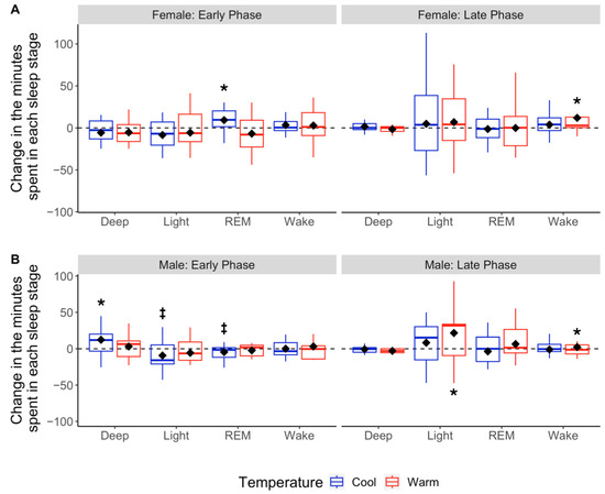 Changes in absolute sleep stage duration based on cool vs. warm sleepers in Early and Late Phases. Boxplots depicting distributions of changes in time (min) spent in each sleep stage for Pod OFF vs. cool (blue) or warm (red) temperatures during the Early and Late Phases for females (A) and males (B). The black diamonds denote sample means, and the horizontal lines within the boxes denote medians. The dotted line at 0 indicates no change from Pod OFF Baseline to Pod ON. * Indicates a significant difference in linear mixed models from Pod OFF Baseline at p < 0.05, and ‡ indicates trending toward significance at p < 0.10.