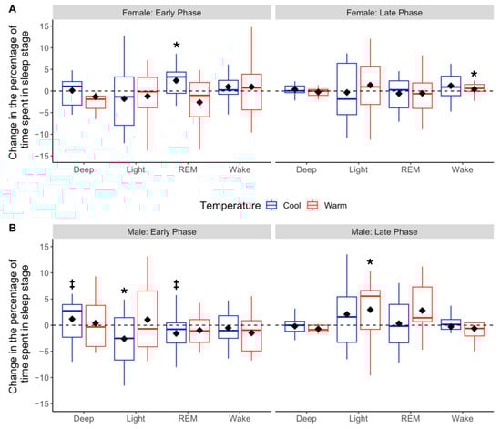 Changes in the percentage of total sleep time spent in each sleep stage based on cool vs. warm temperatures in Early and Late Phases. Boxplots depicting distributions of changes in the percentage of time spent in each sleep stage for Pod OFF vs. cool (blue) or warm (red) temperatures. Early Phase (left-hand panels) and Late Phase (right-hand panels) are separated for females (A) and males (B). The black diamonds denote means, and the horizontal lines within the boxes denote medians. The dotted line at 0 indicates no change from Pod OFF Baseline to Pod ON. * Indicates a significant difference in linear mixed models from Pod OFF Baseline at p < 0.05, and ‡ indicates trending toward significance at p < 0.10.