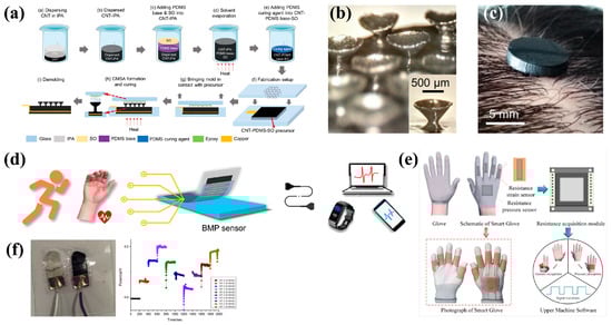 Flexible wearable healthcare devices on PDMS. (a) flow chart shows the fabrication of the CMSA sensor; (b) the microstructure of CMSA sensor; (c) the CMSA sensor can stick to the scalp to measure the EEG. Images reprinted from [28] with permission; (d) schematic diagram of the thin PDMS film-based sensor applied for portable human physiological signal acquisition. Images reprinted from [29] with permission; (e) image shows the integration of the resistive sensors with a smart glove for gesture recognition and perception detection. Images reprinted from [30] with permission; (f) adhesion between the electrodes and the PDMS composite substrate after the tensile test proved better than using pure PDMS. Images reprinted from [31] with permission.
