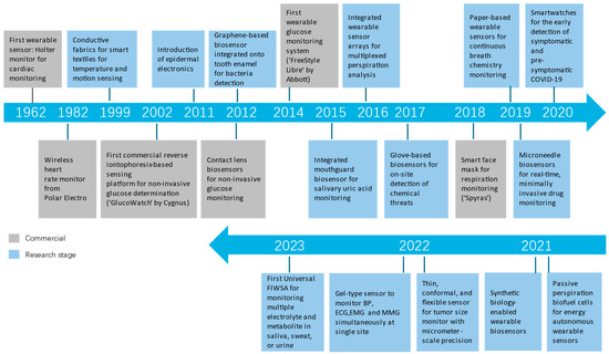 Timeline of significant milestones in the development of wearable sensors. (This diagram is based on a figure in [111]. Images reprinted with permission.) Added representative works in 2022 [112,113] and 2023 [114].