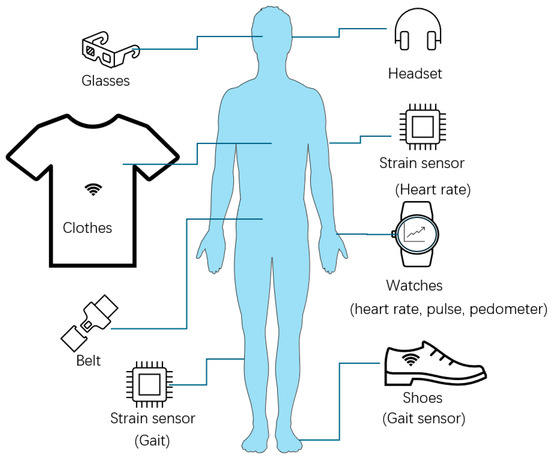 The first-generation wearable biosensor devices are based on physical mechanisms and can be smartphones, smart watches, shoes, or headphones [111]. Figure 6 shows some typical examples. Among them, smartwatches have been widely accepted. Many applications, such as pedometers on smartwatches or smartphones, are designed for travel history, fitness, and exercise [111,115,116]. Travel history is widely used during the coronavirus disease (COVID-19) pandemic [115].