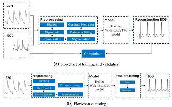 This section discusses the dataset used in this study, the ECG and PPG signal preprocessing procedures, the proposed deep neural network structure, and the metrics for evaluation of model performance. Figure 1 is the flowchart for the model, with the training and verification process shown in Figure 1a and the testing process in Figure 1b.