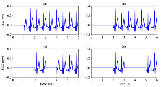 Figure 2. Missing ECG signal. (a) miss 1 s of ECG signal; (b) miss 2 s of ECG signal; (c) miss 3 s of ECG signal; (d) miss 4 s of ECG signal.