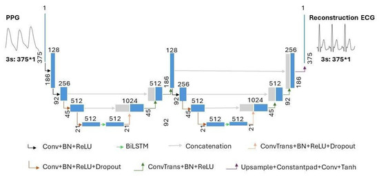 There have been some studies on the reconstruction or prediction of missing physiological signals. Two studies [18,19] involved the reconstruction or prediction of missing PPG signals. In [18], missing segments were predicted using a personalized convolutional neural network (CNN) and long short-term memory (LSTM) models using the short-term history of the same channel data. In [19], the authors proposed a method for short-history prediction of missing and highly corrupted data segments of time series PPG data based on a recurrent neural network (RNN). Three studies [20,21] focus on predicting missing ECG signals. In [20], the authors proposed an interpolation method based on parametric modeling to retrieve missing samples in ECG signals. In [21], the authors proposed the prediction of missing segments of ECG signals based on a bidirectional long short-term memory recurrent neural network (LSTM-RNN). Two studies [22,23] involved the reconstruction of missing cardiovascular (ECG and PPG) signals. In [22], A novel method for reconstructing damaged segments based on signal modeling is proposed. In [23], a model-based approach is proposed to reconstruct corrupted or missing intervals of ECG signals acquired along with PPG signals. However, these studies did not utilize the correlation between ECG and PPG to reconstruct ECG signals. This study proposes a deep learning method to reconstruct missing ECG signals from PPG measurements. In the existing PPG reconstructed ECG model, there are no missing signals in the ECG signal in the training dataset. In this study, however, the ECG signals are missing from the training set. Every recording of the ECG signal in this study was missing 1 s, 2 s, 3 s, or 4 s. This study proposes a neural network model that combines a dual-UNet structure and a bidirectional long short-term memory network. The performance of this model is validated using the MIMIC III matched subset.