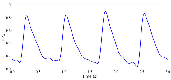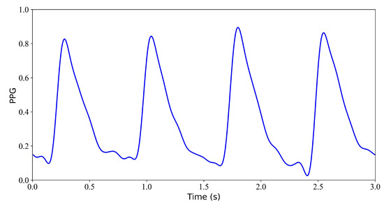 - Normalization and Segmentation. After aligning the data, the PPG signal is scaled to the range [0, 1]. Due to alignment, the length of signals will be less than 300 s. To ensure that each record is the same length, we consider only the first 294 s of data and ignore any data afterward. Specifically, each record is divided into 3 s.