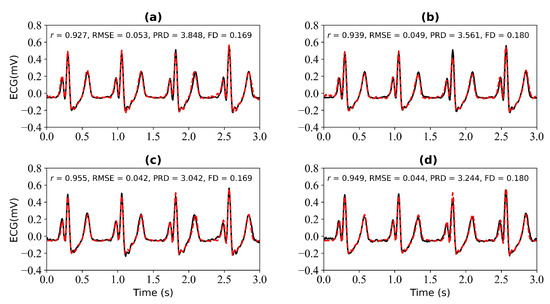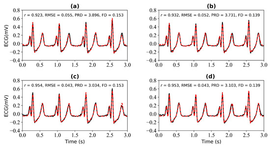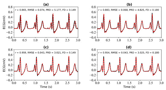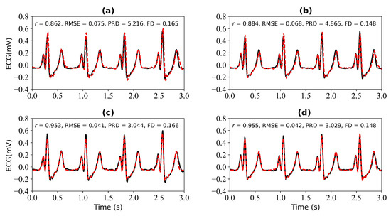 Reconstruction results for 3 s and 4 s of missing ECG signals: (a,b) represent the reconstructed missing ECG results at 3 s and 4 s, respectively; (c,d) represent the experimental results of (a,b) using cross-correlation alignment, respectively. r, RMSE, PRD, and FD represent Pearson’s correlation coefficient, root mean square error, percentage root mean square difference, and Fréchet distance. The black line represents the actual ECG signal (the reference ECG signal). The red line represents the reconstructed ECG signal.