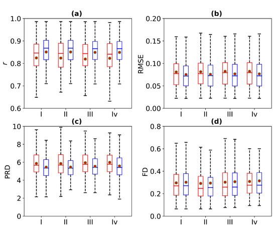 Figure 8 is a box plot of the Pearson correlation coefficient, RMSE, PRD, and FD for 1 s, 2 s, 3 s, and 4 s of missing ECG signals. Here, the red wireframe represents the experimental results when 1 s, 2 s, 3 s, and 4 s of ECG signals are missing, and the blue wireframe represents the experimental results when 1 s, 2 s, 3 s, and 4 s of ECG signals are missing after using cross-correlation. The dots and horizontal lines represent the mean and median values, respectively. Experiments I, II, III, and IV represent 1 s, 2 s, 3 s, and 4 s of missing ECG signals, respectively. As can be seen from Figure 8, the mean ranges of r, RMSE, PRD, and FD of the reference and reconstructed ECG signals are [0.8, 0.9], [0.05, 0.1], [4, 6], and [0.2, 0.4], respectively. Figure 8 shows a more intuitive representation of the overall distribution of the model performance indicators when missing 1 s, 2 s, 3 s, and 4 s of ECG signals.