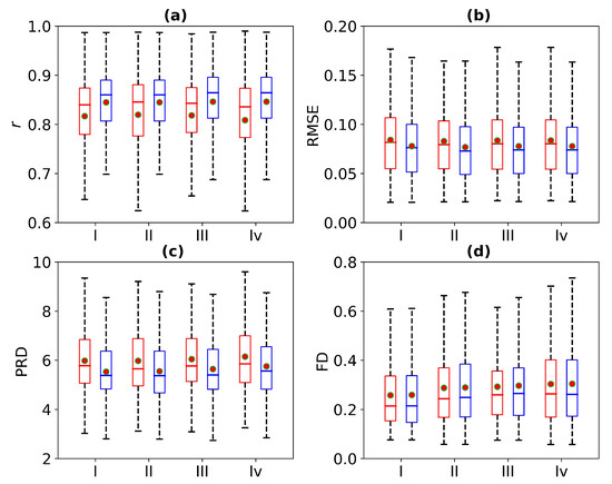 Comparison of ECG reconstruction performance for Experiments I, II, III, and IV. The statistics of (a) Pearson’s correlation coefficient r, (b) root mean square error (RMSE), (c) percentage root mean square difference (PRD), and (d) Fréchet distance (FD) are summarized in the box plots. The red wireframe represents the experimental results when 1 s, 2 s, 3 s, and 4 s of ECG signals are missing, and the blue wireframe represents the experimental results when 1 s, 2 s, 3 s, and 4 s of ECG signals are missing after using cross-correlation.