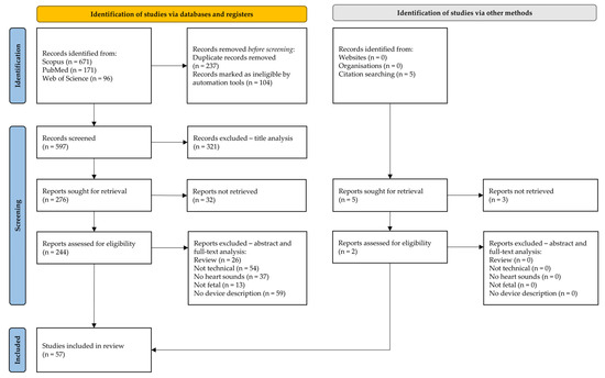 - Eligible works must be related to heart sounds. Identified keywords: “phonocardiography”, “heart sounds”, “FPCG”, “PCG”, “heart murmur”, “acoustic cardiography”, “auscultation”;