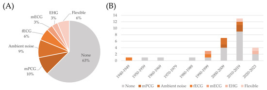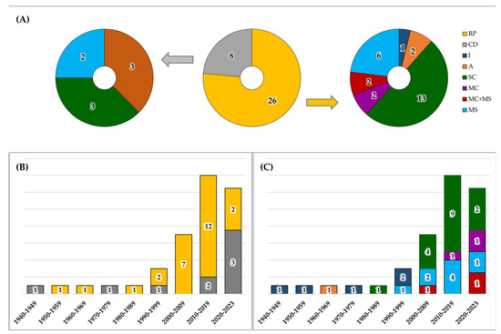 The publication year of selected studies ranges from 1941 to 2023, and they can be classified into 31 journal papers, 25 conference contributions, and one book chapter. The studies described 34 devices for FPCG acquisition, divided into 26 RPs and 8 CDs (Figure 4A). Among the RPs, one belongs to I class, two belong to A class, thirteen belong to SC class, two belong to MC class, six belong to MS class, and two belong to both MC and MS classes. Among CDs, three belong to A class, three belong to SC class, and two belong to MS class. The analysis reveals that in the field of device design and development, research typically spans over periods longer than 5 years, because it has to include the phases of design, implementation, prototyping, bench testing, and clinical validation. Figure 4B,C summarize the development of devices, classifying them according to the RP and CD classification and type classes, respectively. In both graphs, the size of the bars was normalized according to the number of years in the series class, while the label represents the number of devices in each specific class.