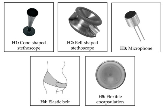 - Device: number, type and position of microphone sensors, availability of other types of sensors, type of sensor–skin interface (head of the sensor), fasten means to the maternal abdomen, system architecture, hardware characteristics (filters, gain, ADC dynamics, sampling frequency, type of processor, memory, power supply);