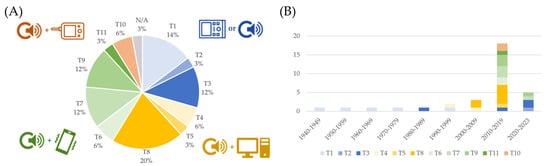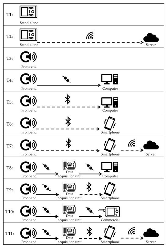 Table 2 and Table 3 summarize the hardware features in terms of sensors, system, and hardware characteristics of RPs and CDs, respectively. Results of the studies revealed different types of architecture systems and different types of sensors associated with the devices. According to this finding, we stratified the devices according to five types of head of the sensors (H1–H5), schematically represented in Figure 5, and 11 architecture system templates (T1–T11), schematically represented in Figure 6.