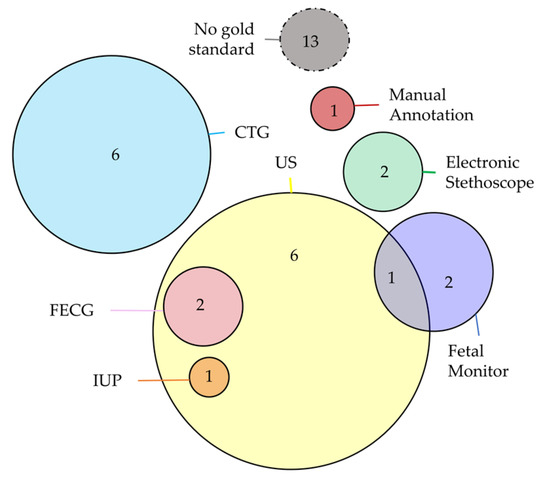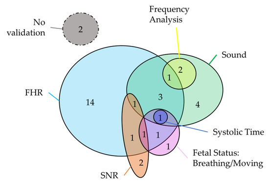 As highlighted in Section 4.3, most of the open challenges are related to the validation phase. Indeed, the observed validation procedures are typically focused on the last trimester of gestation. Nevertheless, the heart of the fetus starts beating during the first trimester, specifically during the sixth week of gestation. Thus, testing the devices on previous gestational weeks may provide deeper insight into fetal heart development and may open up new monitoring possibilities in the future. Then, the validation procedures are usually performed on healthy pregnancies (both from the mother and the fetus perspective), without considering the clinical outcomes of the delivery or the possibility of a multiple pregnancy. Of note, only one of the found devices (RP20) was tested in the case of multiple pregnancy [51,52]. Thus, in the future, it will be interesting to explore the limits of this technology when considering extreme FHR (such as bradycardia, tachycardia, or other arrhythmias), the presence of fetal (such as hypoxia or intrauterine growth retardation) or maternal (such as preeclampsia or gestational diabetes) pathologies, the presence of a correlation with adverse clinical outcomes and in the presence of a multiple pregnancy. Finally, all validation procedures are based on quality appraisal or on feature extraction; thus, a technical comparison with a simultaneously acquired FPCG waveforms is desirable in the future.