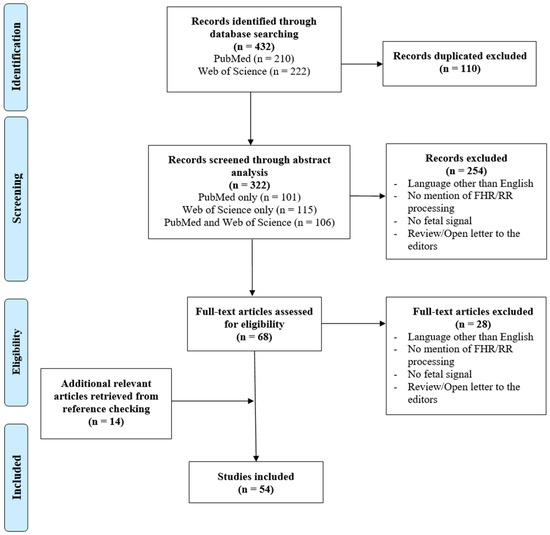 During the eligibility phase, where full-text articles were analyzed, the information was once again organized in a tabular format. This table included more specific characteristics in addition to those mentioned in the screening file. This time, the reviewers specified the type of signal referred to in the article (simply FHR, RR-intervals, or simultaneous FHR and MHR), whether it mentioned artifact detection, correction, or both, the reported signal’s sampling frequency, the resampling technique, the new/final sampling frequency, the acquisition mode and, finally, the filtering/detrending method. Moreover, the reviewers detailed the type of artifacts detected and corrected (missing samples, outliers, MHR-FHR ambiguities, and interferences with other signals). This allowed a more in-depth analysis of the gathered articles, presented in the discussion part of this study. In this phase, each of the 68 articles was read by the three reviewers, who met regularly, to decide whether or not to include an article. As a result, in the eligibility phase, 28 records were excluded (by the same criteria already presented for the screening step) and 14 were added, obtained from reference checking since the reviewers considered them to be relevant for this study and the query did not capture any of them. Finally, a total of 54 articles were included, as illustrated in Figure 2. The protocol for this review was not documented nor prospectively registered.