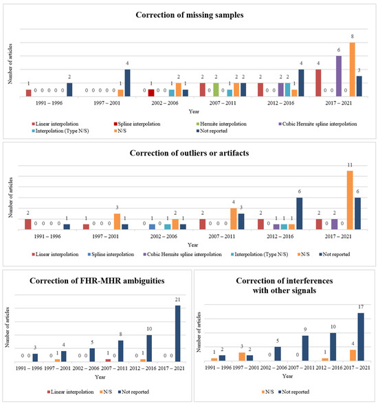 Graphical evolution of the number of articles reporting the correction method of missing samples (top), outliers/artifacts (middle), FHR-MHR ambiguities (bottom, left), and interferences with other signals (bottom, right). Abbreviations: N/S—not specified.