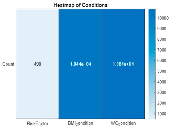 The visual tools of the heatmap and kernel density plot reveal critical insights. The heatmap shows a lower occurrence of ‘RiskFactor’ conditions compared to ‘BMIcondition’ and ‘WCcondition’, emphasizing the prevalence of obesity-related conditions. The kernel density plot indicates a concentration of individuals within a specific age range, guiding focus onto the age group most at risk.