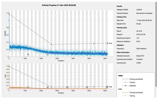 28]. The model’s RMSE initially shows a steep decline, reflecting a quick and significant learning phase. This rapid improvement stabilizes as the training progresses, which is expected behaviour as the model begins to converge. The final-validation RMSE value stands at an impressive 0.36679, pointing to the model’s high level of prediction accuracy. Complementary to the RMSE, the loss metrics plotted over the same iteration span show a similar trend—initially decreasing sharply before plateauing. The alignment between the training and validation loss indicates the model’s successful generalization, suggesting it can reliably extend its predictions to unseen data without significant overfitting.