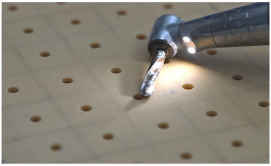 A total of 150 implants (Winsix, Biosafin, Ancona, Italy), each measuring 3.8 × 11 mm, were used. These implants had a cylindrical shape with a conical apex and a double-threaded system. The groups were classified based on the bone density and the technique employed for the preparation of the dental implant site. According to the bone density, there were two distinct categories, as follows: one with a bone density of 30 PCF, which mimics the density of the mandibular bone, and another with a bone density of 15 PCF, which closely mimics the density of the maxillary bone. In terms of preparation techniques, we employed the following three different approaches for implant preparation: for group one, we utilized the TD; for group two, we employed the PES approach; and for group three, we used the MM technique. Consequently, there existed a total of six distinct groups. The implants were placed at a constant distance, forming a grid of 1.5-cm-by-1.5-cm squares on the polyurethane blocks (Figure 1). This ensured that the distance between each implant exceeded the minimum distance recommended by clinical guidelines. On the examined polyurethane blocks, 150 implant preparations were conducted, with 25 implants for each group.