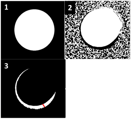 (1)—First Scan of the preparation site (pre), (2)—Second Scan of the inserted screw (post), (3)—overlapping of both scans (pre and post) and determination of the maximum distance between the screw and the bone (red line).
