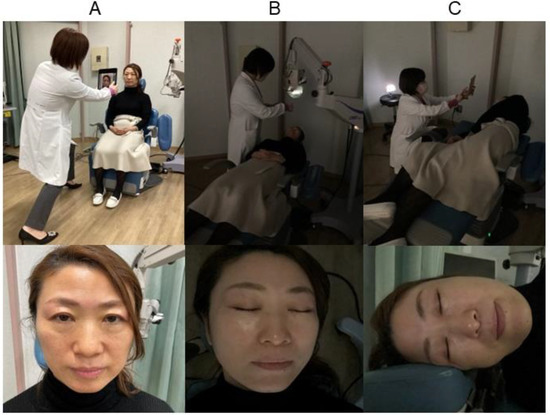 In the images obtained under sufficient illumination in the examination room, the mean illuminance with lighting was 656 ± 74 lux in the sitting position and 536 ± 60 lux in the supine position. The mean illuminance was between 3 and 4 lux in the images obtained with low illumination. When in a supine position with low illumination (Figure 1B), the light from the ophthalmic operation microscope (OMS-90, TOPCON, Tokyo, JAPAN) was adjusted by covering it with gauze to illuminate the front of the face at a brightness of 3-4 lux. And when the patient was in the side lateral position, the photography light (Ulanzi VL49, Guangdong, China) was directed from the front (Figure 1C).
