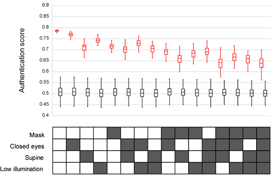 Authentication scores (AS) in 16 patterns depending on the combination of masking, eyes, body position, and illumination. The AS is shown in the upper half, and the 16 patterns are in the lower half. The AS of intentionally wrong patients was significantly lower than that of correct patients for each situation (p < 0.0001). In the upper panel, red boxes = scores for correct patients, and black boxes = scores for wrong patients. In the lower panel, solid boxes = conditions of mask, closed eyes, supine, and low illumination.
